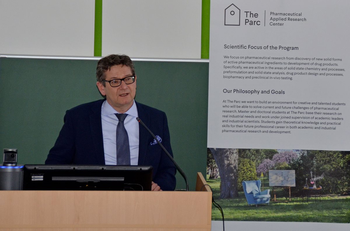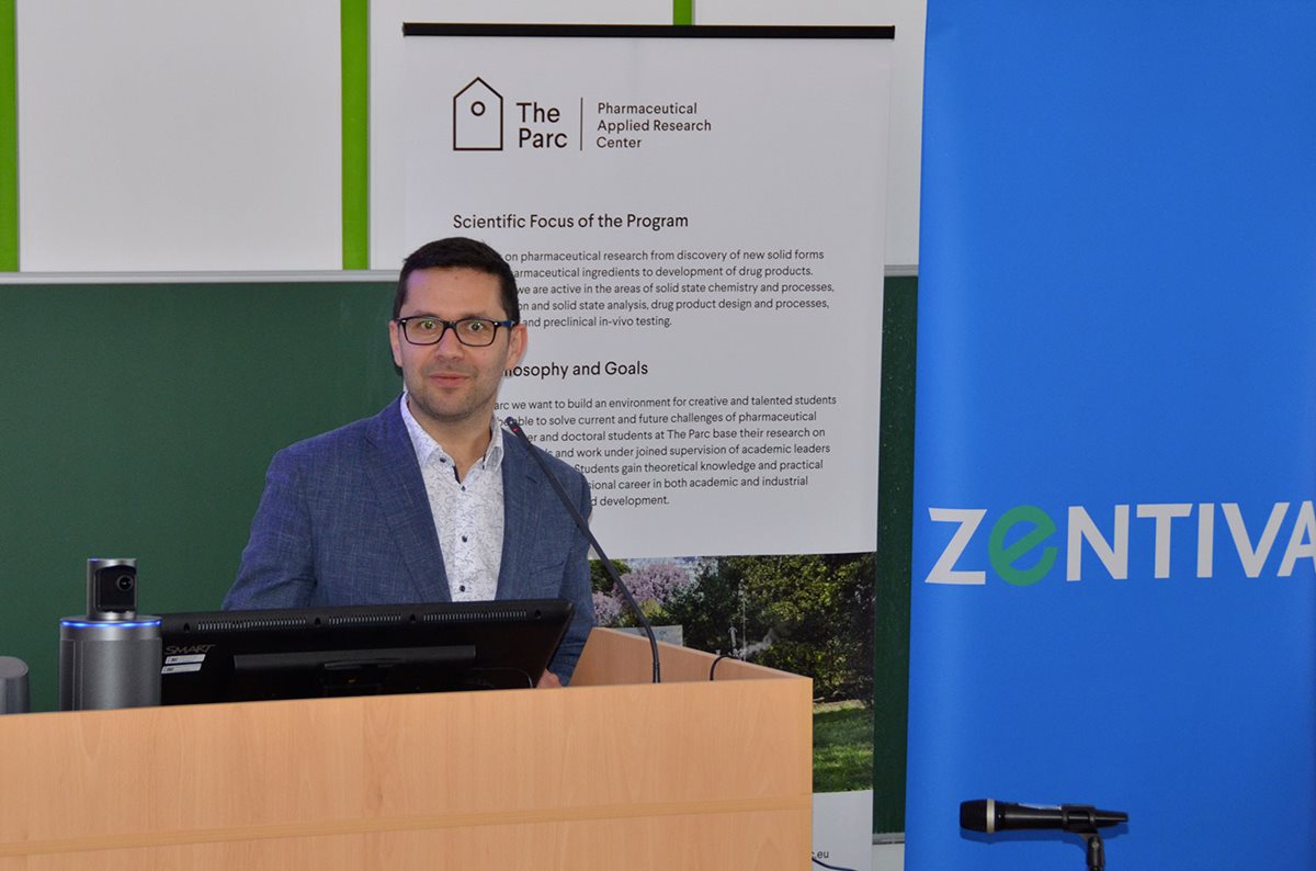 Po přivítání a úvodním slovu pana děkana doc. PharmDr. Jaroslava Roha, Ph.D. převzal slovo PharmDr. Jan Röder ze Zentivy, který poděkoval vedení fakulty za spolupráci, představil společnost Zentiva a uvedl novinky v Zentivě za poslední rok. Zentiva se jako přední hráč tuzemského farmaceutického trhu s více než 5000 zaměstnanci může pyšnit špičkovým výzkumem a vývojem, který také podporuje v rámci Centra aplikovaného farmaceutického výzkumu „The Parc“. „The Parc“ platforma je unikátní vědecká platforma založena Zentivou ve spolupráci s akademickými partnery, která kombinuje akademický výzkum s průmyslovou praxí, a je především určená k odborné přípravě budoucích generací farmaceutických vědců a techniků. V rámci přednášky byl následně představen nový unikátní produkt na Amnioderm, který společnost uvedla na trh v loňském roce. Manažerky Pavla Hrudníková a Marcela Badinová seznámily publikum se složením preparátu, jeho příznivými efekty při léčbě, včetně praktických ukázek léčby formou videa a fotografií. Amnioderm je tkáňový transplantát, který pomáhá hojit chronické rány. Vyrábí se z placenty získávané se souhlasem zdravých rodiček při císařském řezu. Po přednášce proběhla diskuse s řadou dotazů k výrobě tkáňového transplantátu a jeho využití při léčbě.